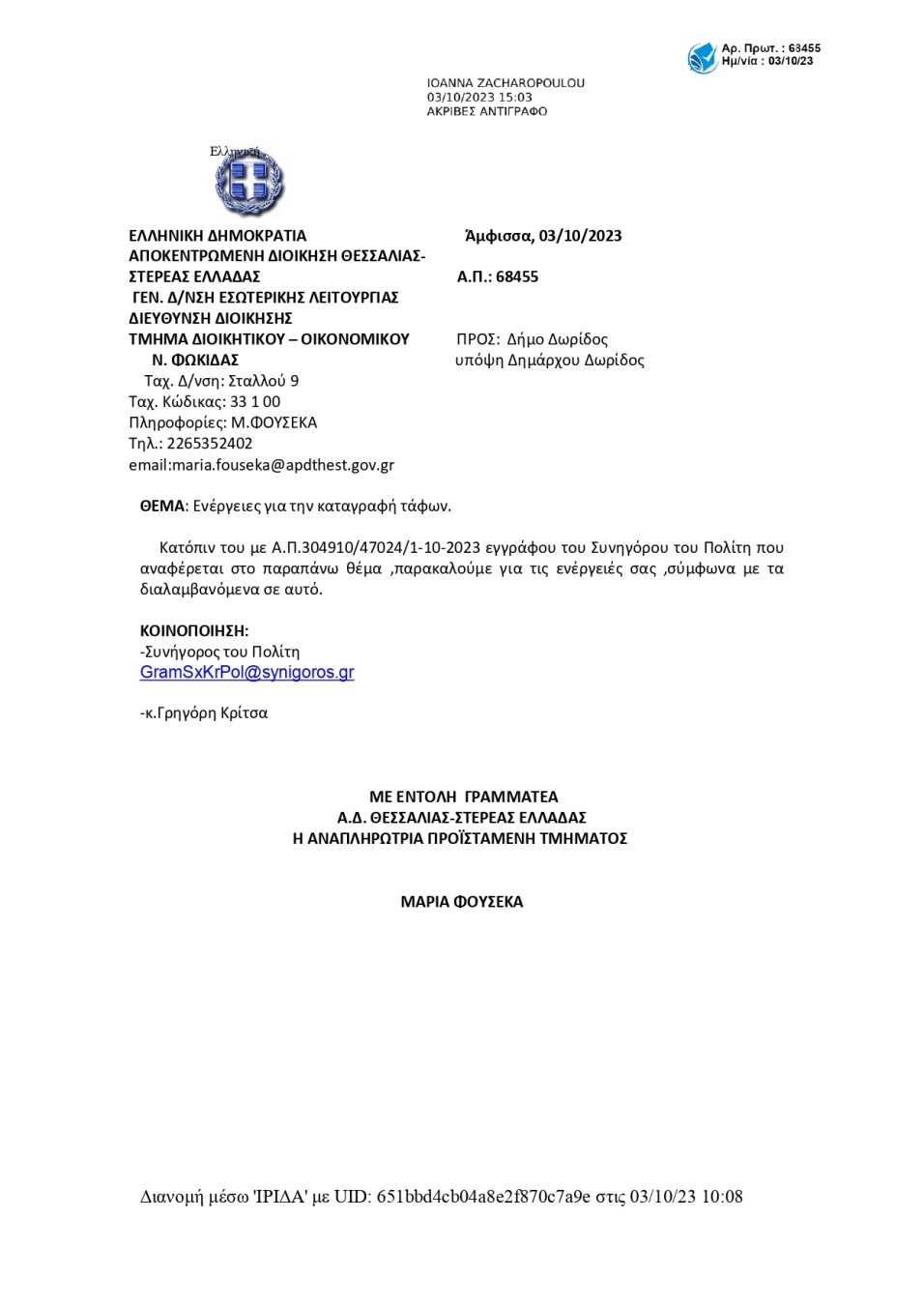 2o)To με Αρ.Πρωτ.: 68455-03/10/2023της ΑΠΟΚΕΝΤΡΩΜΕΝΗ ΔΙΟΙΚΗΣΗ ΣΤΕΡΕΑΣ ΕΛΛΑΔΑΣ «Κατόπιν του με Α.Π.304910/47024/1-10-2023 εγγράφου του Συνηγόρου του Πολίτη που αναφέρεται στο παραπάνω θέμα, παρακαλούμε για τις ενέργειές σας, σύμφωνα με τα διαλαμβανόμενα σε αυτό»
