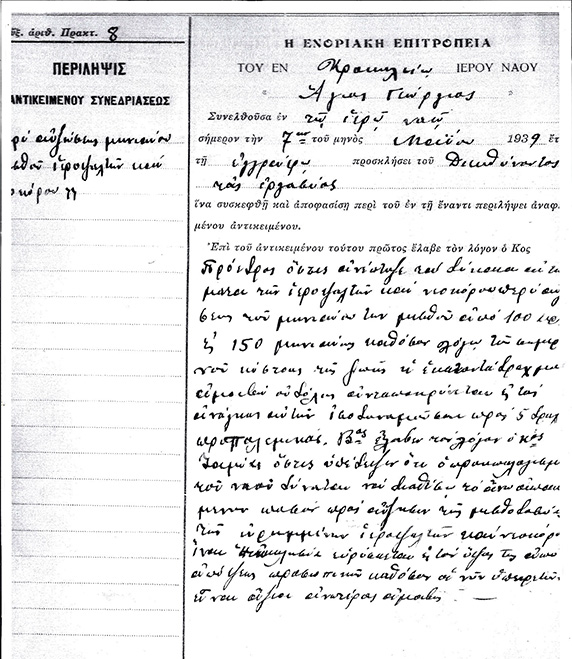 Παρουσιάζουμε εδώ κάποια έγγραφα από την Εκκλησία μας. Η εποχή είναι από το 1939 μέχρι το 1944. Τα έγγραφα περιέχουν ενδιαφέροντα στοιχεία της εποχής. Πρώτα δεν πρέπει να ξεχνάμε ότι τότε οι δαπάνες της εκκλησίας βάρυναν τους κατοίκους που πλήρωναν εισφορά. Βλέπουμε ακόμα το ύψος των μισθών του ιερέως των ψαλτών και του νεωκόρου. Βλέπουμε ακόμα, καθώς προχωρεί η Γερμανική κατοχή, τις δυσκολίες που αντικατοπτρίζονται στις διαρκείς αυξήσεις μισθών και ιεροπραξιών. Μετά βλέπουμε ένα είδος τιμαριθμικής αναπροσαρμογής μισθών και δικαιωμάτων ιεροπραξιών. Στο τέλος, επειδή το νόμισμα δεν είχε αξία, ορίζεται οι συνεισφορές των χωριανών να δίνονται σε είδος. Νομίζουμε ότι θα είναι ενδιαφέρουσα άσκηση να προσπαθήσετε να διαβάσετε το πλήρες κείμενο των χειρογράφων εγγράφων.